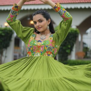 Elegant Reyon gown featuring intricate Kutchi Gamthi embroidery and a graceful 3-layer frill design. With a full cotton lining, fancy front and back neck, and 12-meter flair, this gown ensures comfort and festive elegance.